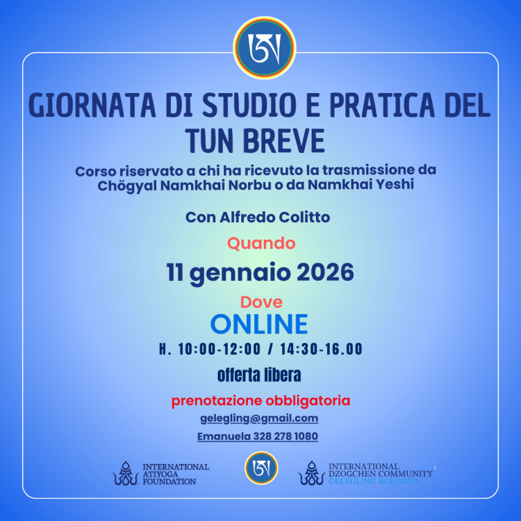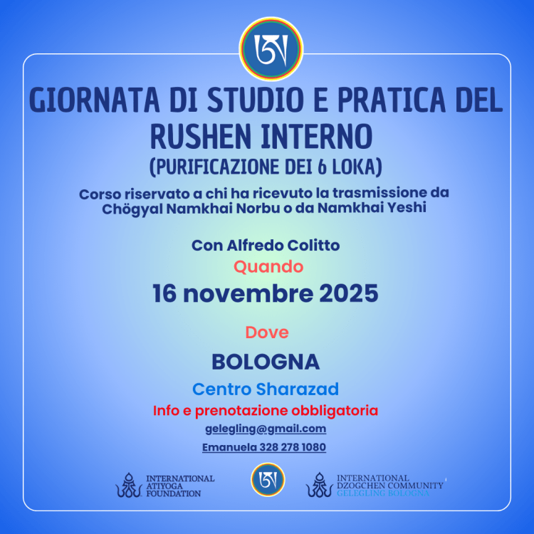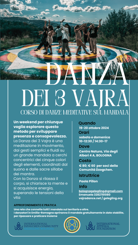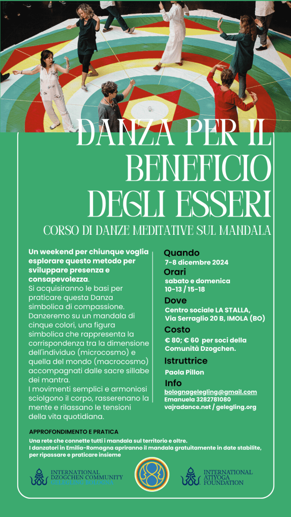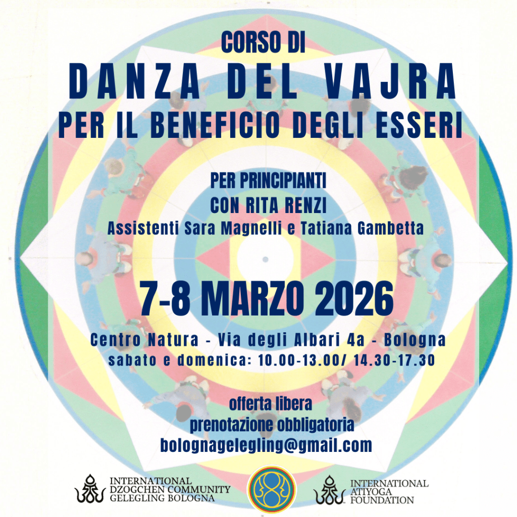 EVENTI E NEWS IGOR BERKHIN A BOLOGNA, 14-16 aprile 2023 Lunedì 13 marzo 2023 PROIEZIONE DI UN DOCUMENTARIO SU SUA SANTITA’ IL XIV DALAI LAMA (sottotitolato in italiano) 17 gennaio al 28 febbraio 2023- Corso di studio e pratica del Canto del Vajra- 10-11-12 marzo 2023 – Corso sulle Quattro Contemplazioni del Semde- Prossimi corsi in lingua italiana tenuti da Alfredo Colitto 12/13 Nov 2022 – Corso per l’uso degli strumenti rituali del Chod 25 febbraio 2022 -Prematura scomparsa della carissima Sorella ANTONELLA FARINA February 11/14, 2022 – Secret Rushen with Elias Capriles – I Rushen Segreti con Elias Capriles 23 dicembre 2021 -Presentazione del volume di Adriano Clemente Visionary Encounters /Incontri Visionari Primo anniversario della scomparsa ELIO GUARISCO 27 novembre 2021 ore 20,15 Ganapuja online e in presenza 27th November, 1st December 2021/ Rudiments of Dzogchen Contemplation in the Series of Pith Instructions 17/19 Settembre – 8/9 Ottobre – 22/24 Ottobre 2021- GURU GOMADEVI course by ENZO TERZANO Isabella Greppi ha lasciato il corpo il 31 agosto 2021 12 maggio 2021 – Gruppo di studio gratuito online sulle Mudra della Pratica di Mandarava guidato da Edith Casadei. FABIO ANDRICO KUMBHAKA, SOGTHIG E TSALUNG DI MANDARAVA – CORSO ONLINE IN LINGUA ITALIANA 30 APRILE, 1,2,3 MAGGIO 2021 19/20 settembre 2020 – Mente ordinaria, saggezza senza limiti. Aprile: 7-14-21-28, 2020 – Corso completo (a distanza) con Alfredo Colitto 24 maggio – 2 giugno 202 – SHAMATHA Il primo ritiro intensivo in Italia guidato da Elio Guarisco The first intensive retreat in Italy led by Elio Guarisco Corso teorico/pratico sul Rushen Segreto – 4/5 aprile 2020 CORSO DI HARMONIOUS BREATHING – 16 febbraio 2020 Corso teorico/pratico sul VII Lojong- 1/2 Febbraio 2020 CORSO CON ELIO GUARISCO: LA COMPRENSIONE DI SE’ NELLO SPAZIO TOTALE DI VAJRASATTVA – BOLOGNA 25-26 Gennaio 2020 CORSO SUL PRIMO LIVELLO DEL SANTI MAHA SANGHA CON FABIO RISOLO da Febbraio a Dicembre 2019 Corso “Costruzione del Namkha” con Liane Graef – 6-8 Dicembre CORSO DI HARMONIOUS BREATHING con Dina Priymak – 19/20 ott – 9/10 nov – 30 nov 1 dic Ritiro di pratica con Fabio Maria Risolo “Semdzin, scoprire la Natura Essenziale”, 23/24 Novembre a Imola Giornata di pratica di Vajrasattva- 17 novembre 2019 Giornata di studio e pratica di Garuda Corso di DANZA DEL VAJRA per il Beneficio degli esseri Giornata di studio e pratica del Tun Breve Giornata di studio e pratica del Rushen Interno PRATICARE INSIEME KHAITA Corso di DANZA DEI TRE VAJRA Presentazione del Libro e Workshop sul BARDO 30-31 maggio 2025 – con Michael Katz Giornata di studio e pratica dell’Upadesha sui 25 Spazi 1 2 3 … 6 Pagina successiva→ Condividi: Fai clic per condividere su Telegram (Si apre in una nuova finestra) Telegram Fai clic per inviare un link a un amico via e-mail (Si apre in una nuova finestra) E-mail Fai clic qui per stampare (Si apre in una nuova finestra) Stampa Mi piace Caricamento...